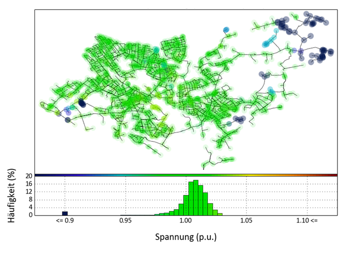 Die Zustandsbewertung der Mittel- und Niederspannungsnetze erfolgt über mehrere Lastflussberechnungen. Zur Bestimmung der thermischen sowie spannungsbedingten Netzbelastungen/-überlastungen werden unter Verwendung der Leistungsmessungen und synthetischen Last-/Einspeiseprofile verschiedene charakteristische Belastungszustände erzeugt und analysiert, z.B.